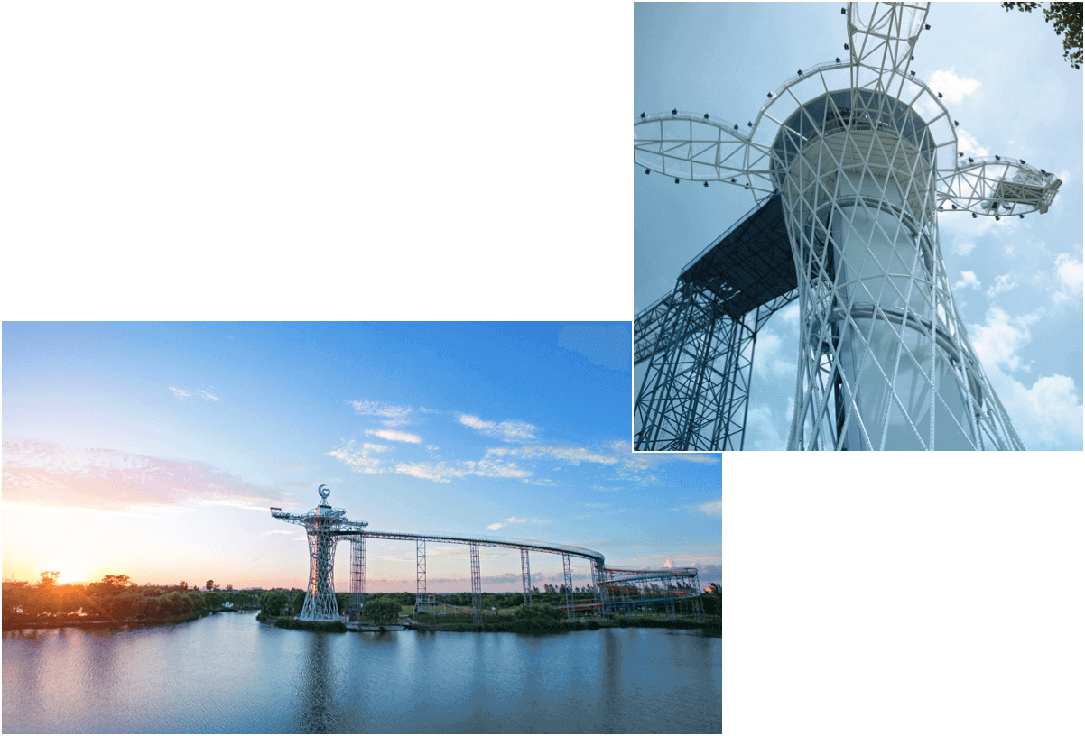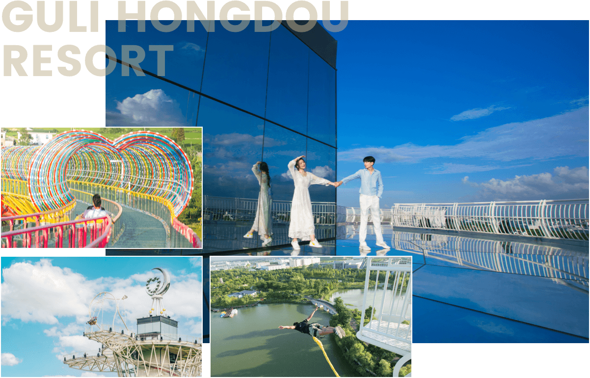 小红蛮腰是目前华东地区首个综合类大型游乐设施,也是红豆山庄的游乐主项目。按照建筑设计,小红蛮腰高达66米,像是迷你版的广州电视塔。在整个小红蛮腰上我们设有当下网红的6个游乐项目,七彩滑道、急速滑筒、空中漫步、高空秋千、蹦极和高空漂流。